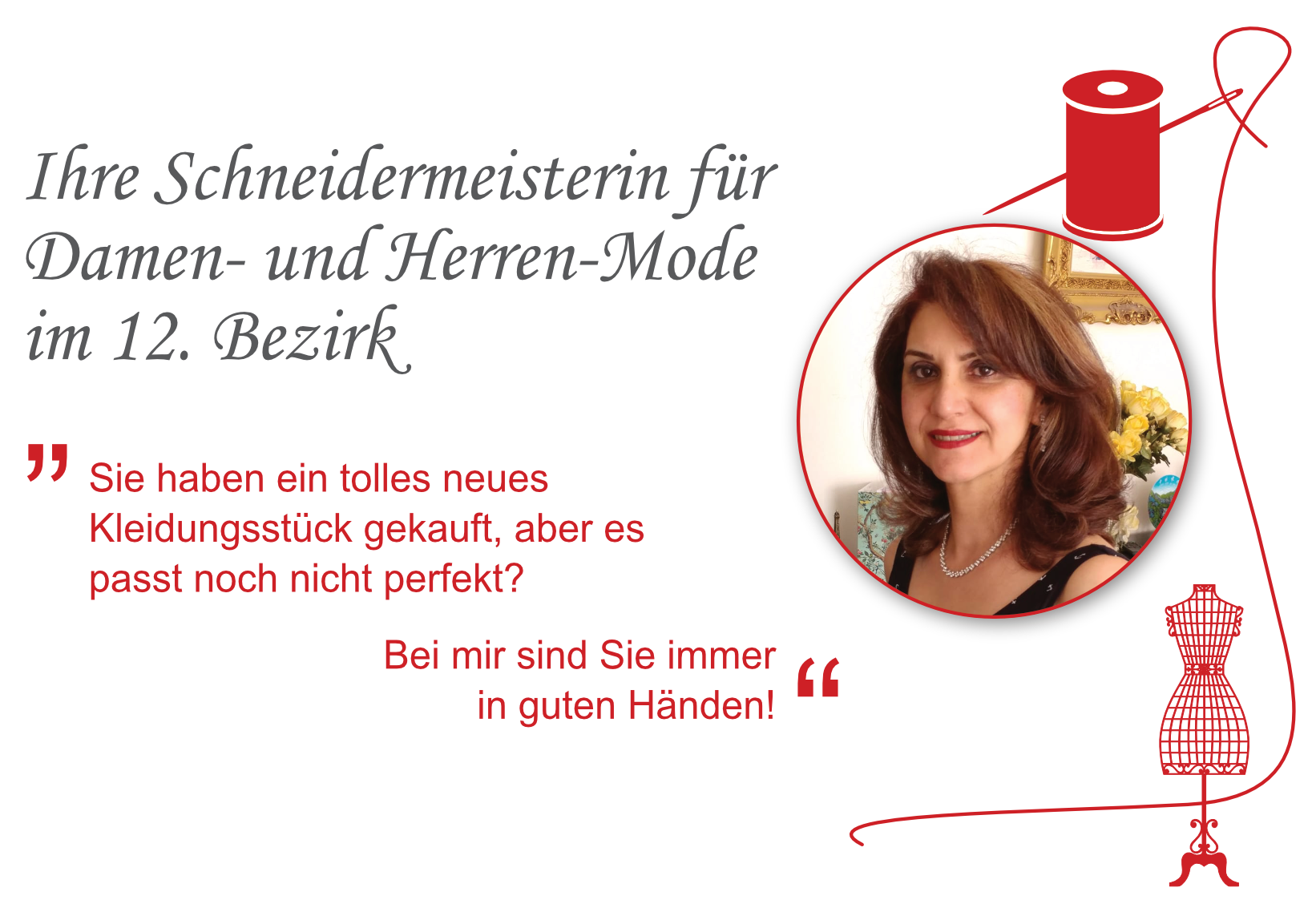 Ich bin Ihre persönliche Schneidermeisterin für Damen- und Herren-Mode im 12. Wiener Gemeinde-Bezirk in der Nähe der U6 Station.